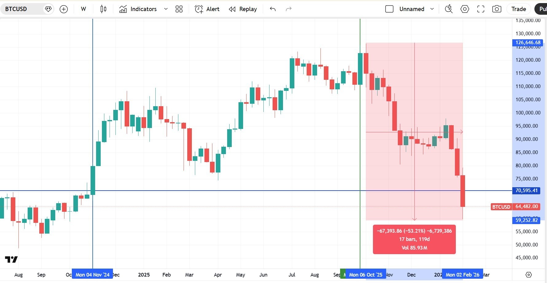 Bitcoin has declined to levels last seen prior to the US elections in November 2024 and is close to 50% below its October 2025 peak.